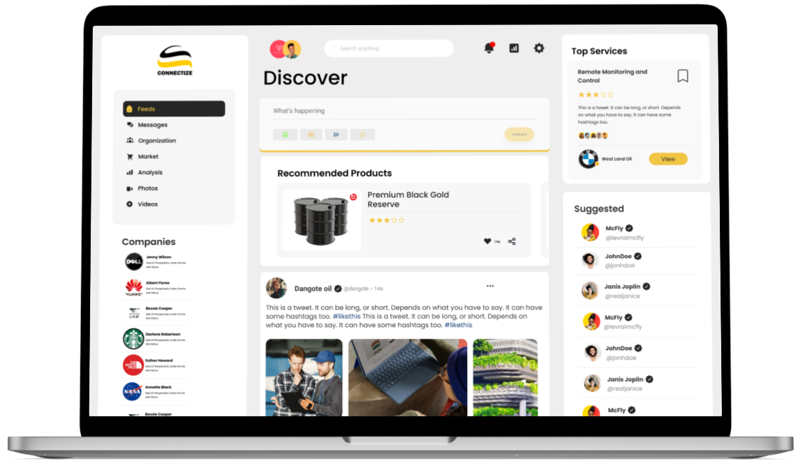 Connectize is a corporate networking platform connecting foreign and Nigerian companies across multiple sectors, including oil and gas. It allows you to list and find products, services, and business opportunities and access industry news, reports, and insights.